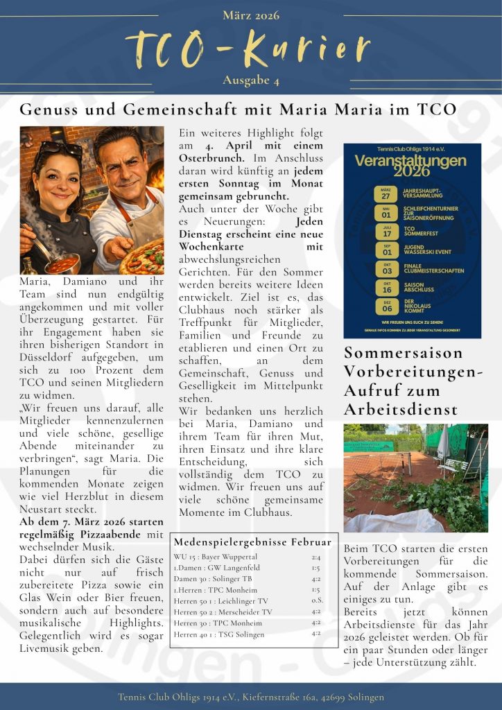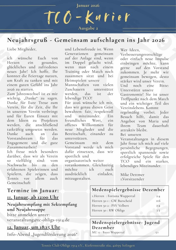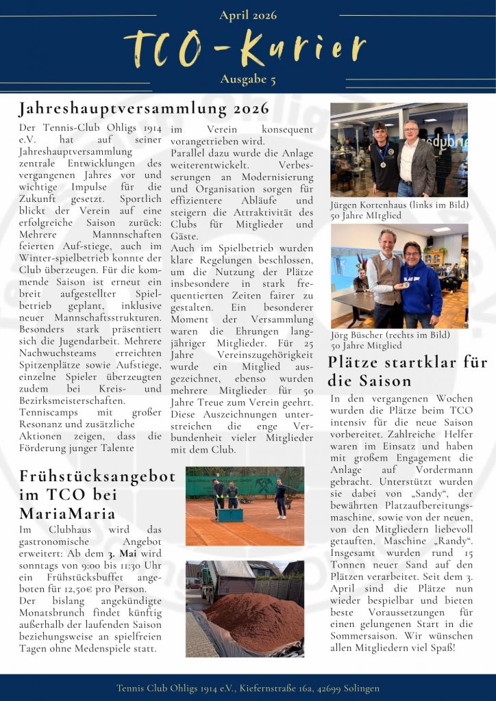 In unserem neuen Vereinskurier erwarten euch aktuelle Themen und Neuigkeiten rund um den TCO, die Ergebnisse der Medenspiele sowie ein eigener Jugendartikel, der monatlich von unserer WU15 verfasst wird. Außerdem erhaltet ihr eine Übersicht über anstehende Termine und viele weitere interessante Inhalte.
